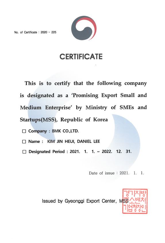 Promising Export Small and Medium Enterprise 페이지 정보 작성자 비엠케이 작성일21-01-22 10:56 조회2,750회 관련링크 이전글 다음글 목록 본문 'Promising Export Small and Medium Enterprise' by Ministry of SMEs and Startups(MSS), Republic of Korea 이전글 다음글 목록